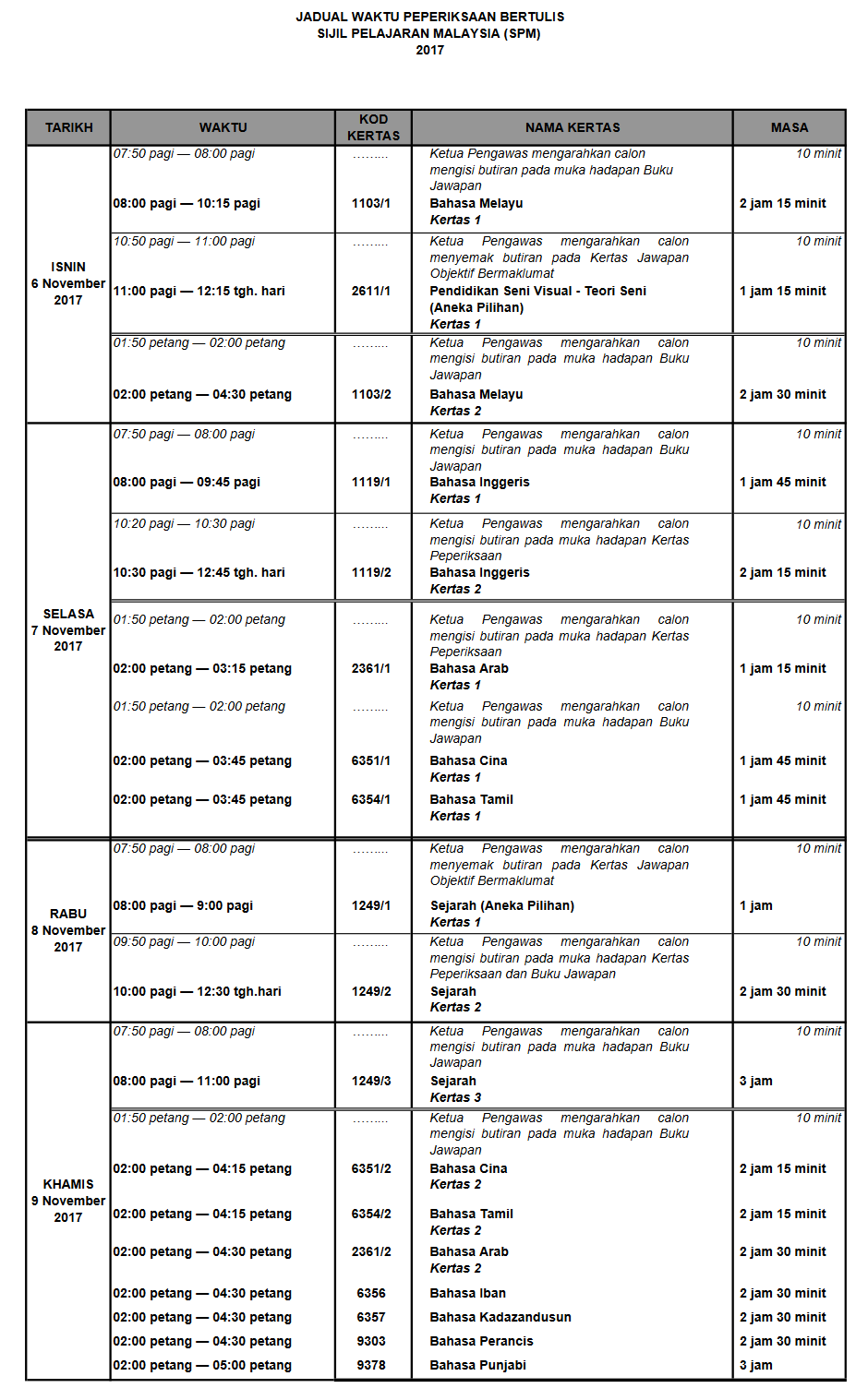 Jadual Peperiksaan Spm 2017 Idea Terkini