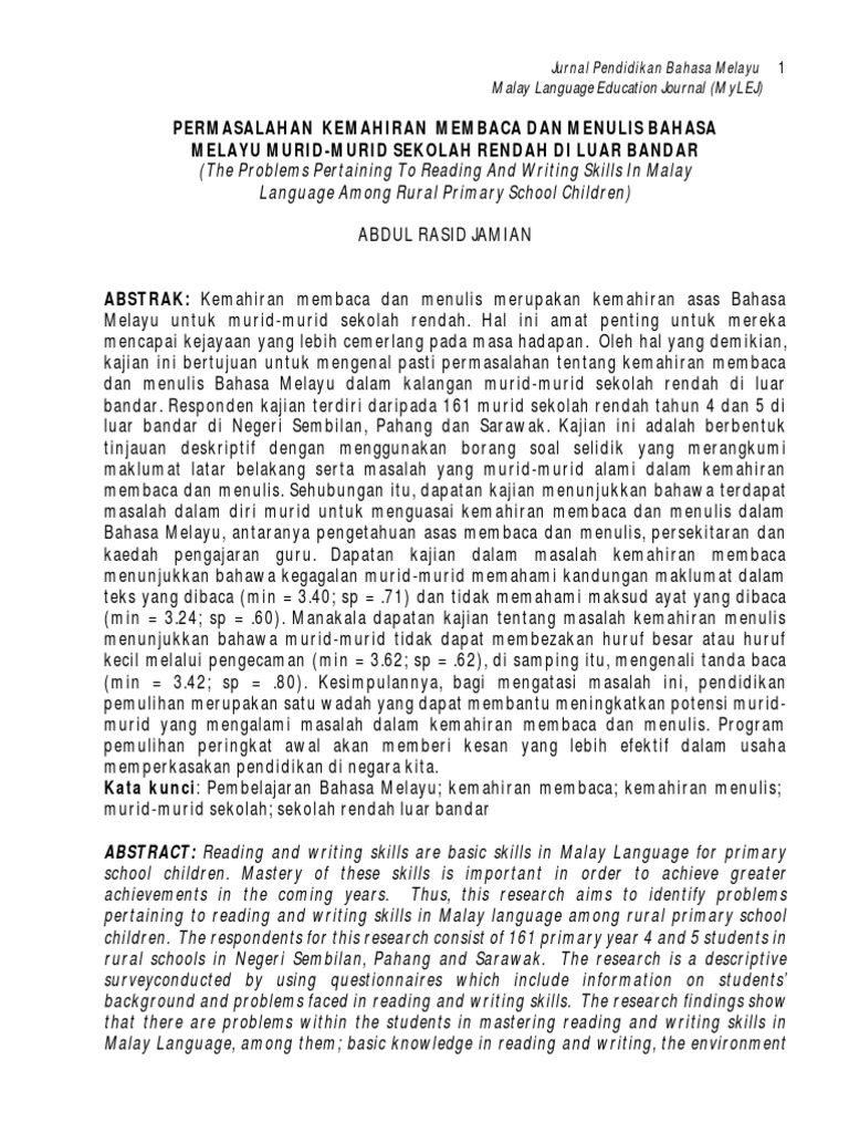 Pdf Jurnal Permasalahan Kemahiran Membaca Dan Menulis Bahasa Melayu Murid Murid Sekolah Rendah Di Luar Bandar The Problems Pertaining To Reading And Writing Skills In Malay Language Among Rural Primary School Children