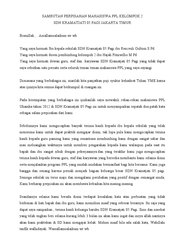 Sambutan Perpisahan Mahasiswa Ppl Kelompok 2
