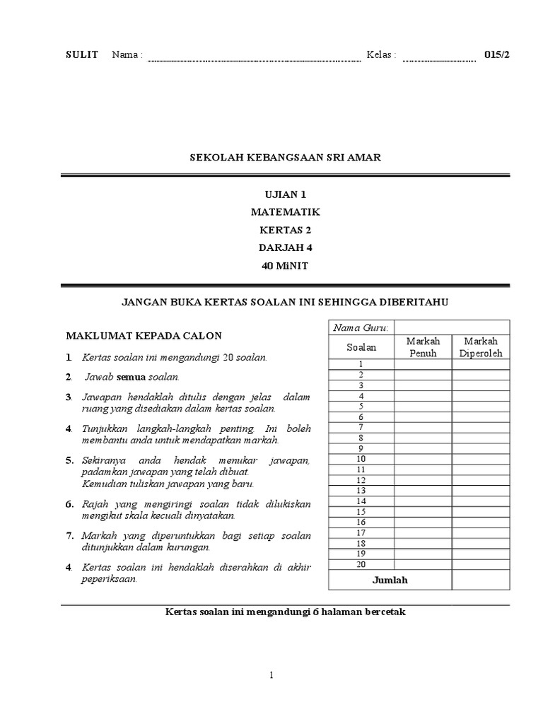 Kertas 2 Ujian 1 Matematik Tahun 4